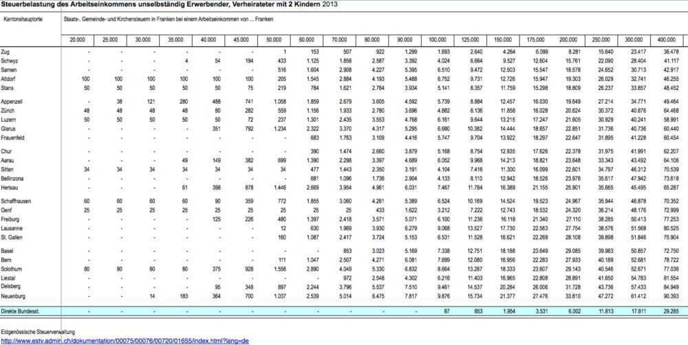Abb. 2: Für Personen mit Einkommen zwischen 250’000 und 400’000 CHF sind Zug, Schwyz und Samen top. (Quelle: Eidgenössische Steuerverwaltung)