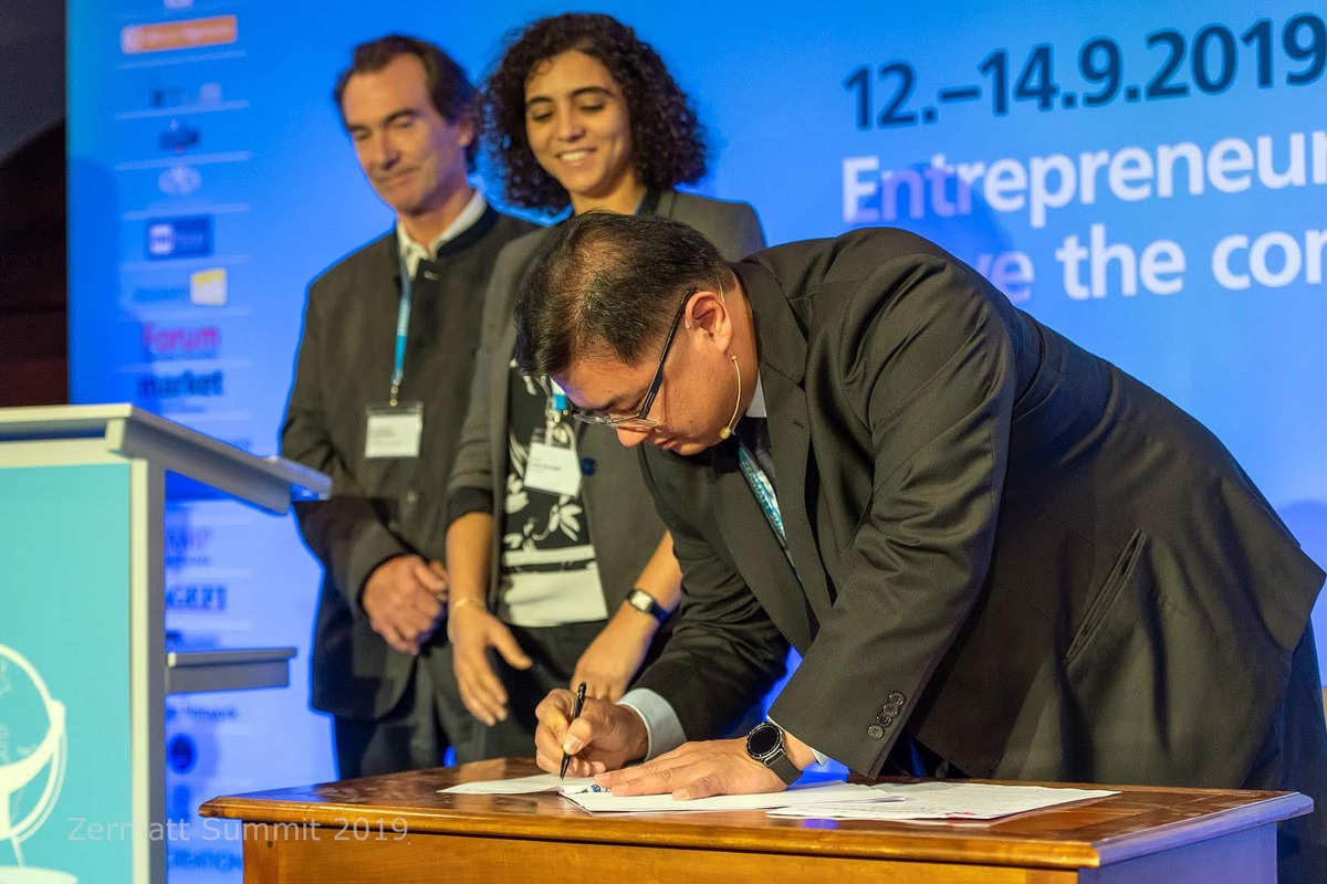 Ein weiteres konkretes Beispiel dafür, dass am Zermatt Summit nicht nur gesprochen, sondern gehandelt wird, ist die Zusammenarbeit zwischen dem taiwanesischen „Stone Paper“-Hersteller Taiwan Lung Meng (LM) und dem führenden marokkanischen Exporteur von Phosphatgestein OCG Group Marokko. LM hat vor einigen Jahren eine einzigartige Papierherstellungstechnologie entdeckt, die ganz ohne Holz auskommt. Das Unternehmen verwendet eine Mischung aus Mineralpulver, wie es in vielen Steinen vorkommt und ungiftigen Harzen. Für diese ökologisch nachhaltige Papierherstellung aus Stein müssen keine Bäume gefällt werden und es braucht wenig Wasser. Diese Lösung ist bereits in 40 Ländern patentiert. In Zermatt traf sich der Präsident Henry Liang von LM mit Asma Jajjani, Head Corporate Innovation von OGC, um eine Zusammenarbeit zu vereinbaren und zu unterzeichnen. Eine weitere Erfolgsgeschichte, die ihren Anfang am Zermatt Summit nahm.