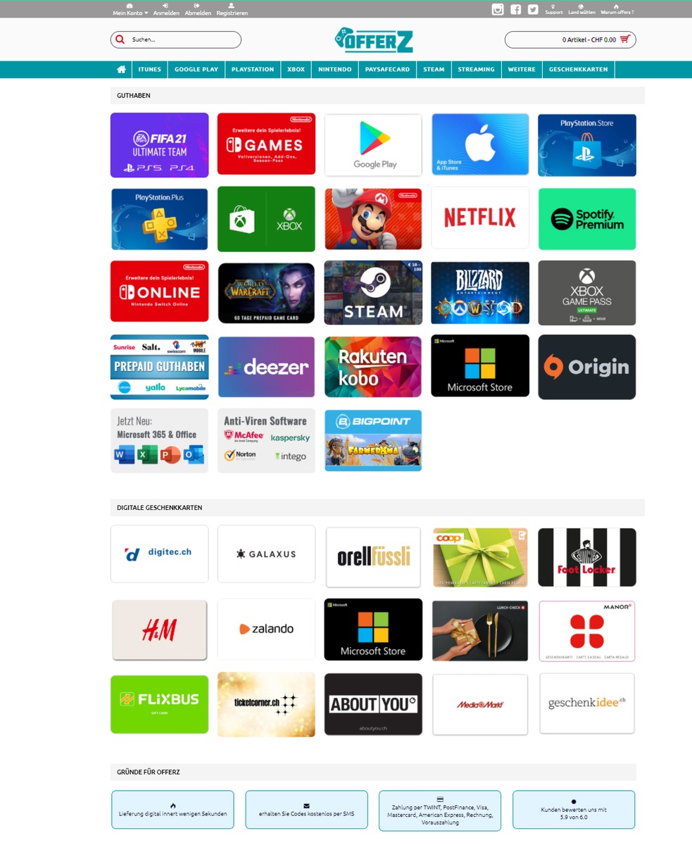 Offerz ist der Onlineshop für digitale Prepaidprodukte. Egal ob eine Guthabenkarte für Playstation, Xbox, Nintendo, Blizzard, Spotify, iTunes & Google, eine digitale Geschenkkarte für Zalando, ABOUT YOU, Manor, MediaMarkt, Coop, H&M, Digitec/Galaxus und mehr oder auch Prepaid Telefonguthaben für Swisscom, Salt, Sunrise und vielen weiteren Marken. Auf offerz.ch ist alles innert wenigen Sekunden digital verfügbar, ohne Zusatzkosten.
