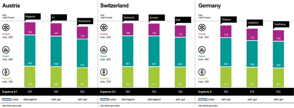 In Deutschland konnte sich die Telekom gegenüber dem Vorjahr noch einmal steigern und holt sich mit 926 Punkten und der Note „sehr gut“ den ersten Platz – zum zehnten Mal in Folge. Dabei übernimmt die Telekom in allen Disziplinen die Führung: in der Sprach-, der Daten- und auch in der Crowdsourcing-Disziplin. Der laufende 5G-Ausbau trägt sichtbar zum Gesamtergebnis bei. Vodafone sichert sich mit 876 Punkten den zweiten Platz und erhält ebenfalls die Note „sehr gut“. Die Düsseldorfer konnten sich gegenüber dem Vorjahr ebenfalls erneut in allen drei Testdisziplinen verbessern. O2 machte im Vergleich zum Vorjahr den größten Sprung. Mit fast 100 Punkten Verbesserung landet der Münchener Netzbetreiber mit 852 Punkten auf dem dritten Platz und erhält zum ersten Mal ebenfalls die Note „sehr gut“. Dreimal „sehr gut“ hat es bisher in Deutschland noch nicht gegeben und zeigt, dass die Netzbetreiber deutlich nachgelegt haben.