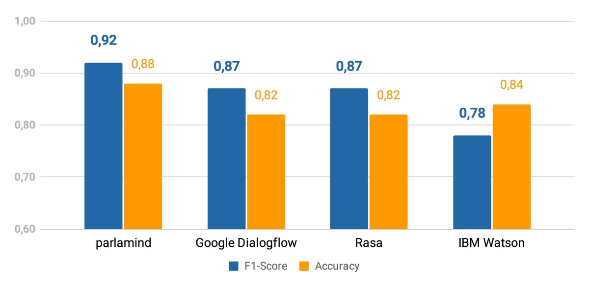 Berlin (ots) – parlamind, Experte für Kundenkommunikation mittels KI, ist stolz auf das Erreichte: Im Test schneidet ihre KI beim korrekten Erkennen von Kundenanliegen besser ab als die KI, auf der Google Dialogflow ES, Rasa und IBM Watson Assistant basieren. In Zahlen ausgedrückt bedeutet das: Bei einer Accuracy von 0,88 wie bei parlamind können nur 12% der eingehenden Anfragen nicht beantwortet werden, bei IBM Watson sind es 16%, bei Rasa und Google Dialogflow 18% (1).