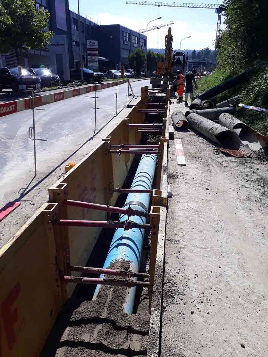 Die Stadt St. Gallen hat einen Trinkwassertagesbedarf von 20″000 bis 25″000 m3. Dazu kommt der Bedarf von Partnern der Regionalen Wasserversorgung St. Gallen. Bei einem Ausfall der Frasnachter Hauptleitung muss die Ersatzleitung deshalb 32″000 m3 Wasser pro Tag liefern. Für die neue Leitung setzen die St. Galler Stadtwerke Duktilgussrohre mit einer Innen- und einer Aussenzementierung, einer Standardlänge von 6 m und einem Durchmesser von 600 mm ein. Die Kosten für dieses Projekt betragen 17,1 Millionen Franken. Die neue Leitung beginnt im Gebiet Bruggmühle in Goldach und endet an der Zil-Kreuzung in St. Gallen Neudorf. Die erste Bauetappe vom Juni 2020 bis Dezember 2020 umfasst rund 900 m von der Bushaltestelle Obere Waid bis zur Zilstrasse. Die Transportleitung verläuft hier in der Rorschacher Strasse mit einem täglichen Verkehrsaufkommen von 10″000 Fahrzeugen.