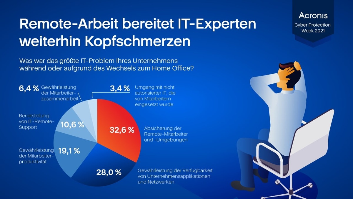Obwohl Unternehmen im Jahr 2020 in neue Lösungen investiert haben, um ihre MitarbeiteInnen im Home Office während der COVID-19-Pandemie zu unterstützen und abzusichern, zahlen sich diese Investitionen nicht aus. Eine aktuelle globale Umfrage von Acronis zeigt, dass 80 % der befragten Unternehmen bis zu 10 Lösungen für Cyber Security und Data Protection parallel nutzen. Jedoch verzeichnete mehr als die Hälfte dieser Unternehmen im letzten Jahr unerwartete Ausfälle aufgrund von Datenverlusten.
