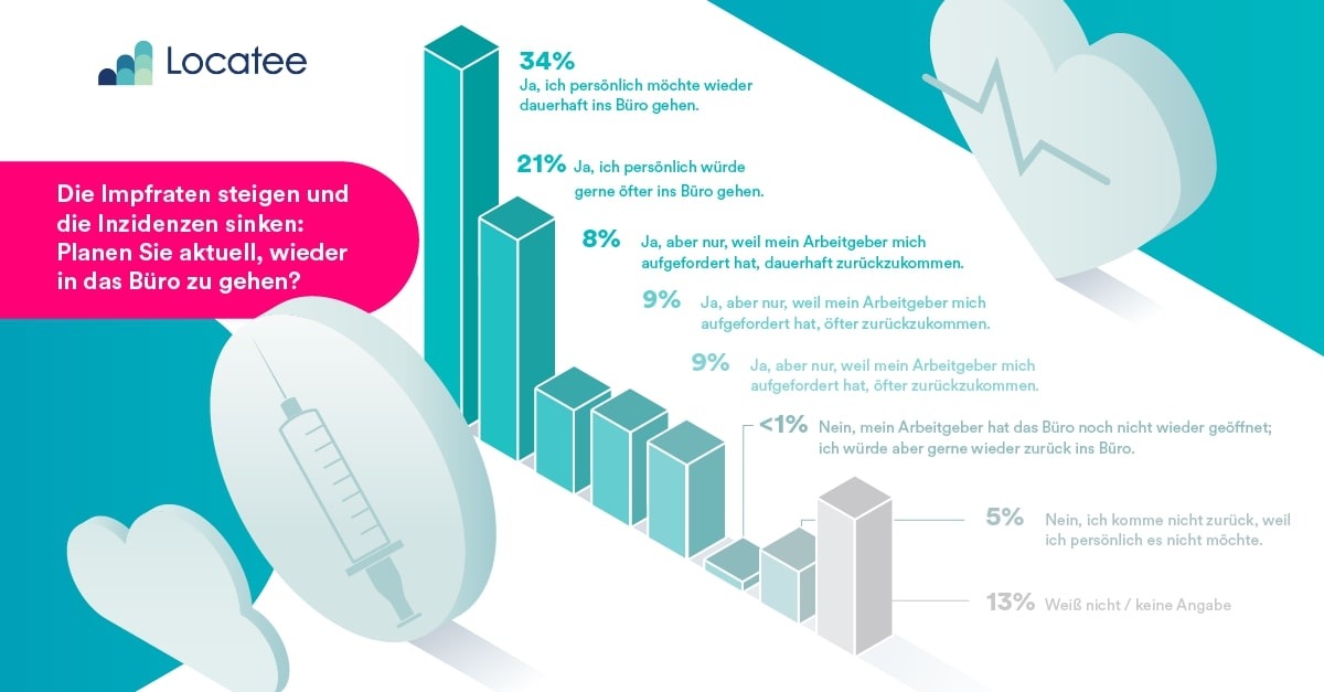 Nach knapp eineinhalb Jahren Pandemie sind die Auswirkungen auf die künftige Arbeitsorganisation deutlich zu spüren. Auf die Frage, ob angesichts der steigenden Impfraten und sinkenden Inzidenzen eine Rückkehr an den Büroarbeitsplatz geplant ist, gaben nur 34 Prozent der deutschen Büroangestellten an, dies wieder dauerhaft tun zu wollen, gefolgt von 21 Prozent, die zumindest gerne öfter in das Büro kommen wollen. Weniger als ein Prozent der Befragten gibt an, dass sie gerne wieder in das Büro zurückkehren wollen, aber dieses noch geschlossen ist.