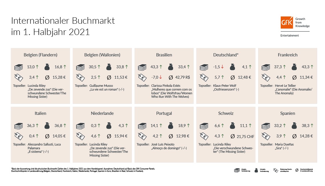 Zur Studie: Basis der Auswertung sind die physischen Buchmarkt-Zahlen für das erste Halbjahr 2021 auf Handelspanel-Basis für die Länder Belgien (Flandern/Wallonien), Brasilien, Frankreich, Italien, Niederlande, Portugal, Spanien und Schweiz sowie auf Basis des GfK Consumer Panels für Deutschland, jeweils ohne Abos und Downloads.