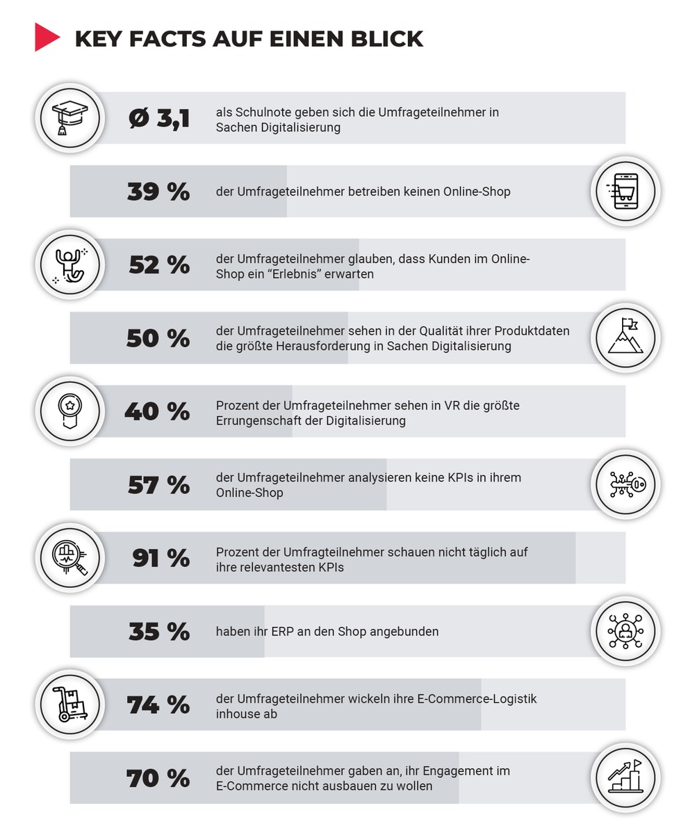 Als größte Herausforderung im Bereich der Digitalisierung gaben die Befragten zu fast 50 Prozent die „Qualität der Produktdaten“ und fast ein Viertel (22 Prozent) die „allgemeine Rückständigkeit der Möbelbranche“ an. Auch die mangelnde Verfügbarkeit von IT-Ressourcen, der Aufbau von Online-Marketing-Know-how und die Digitalisierung des Sortiments wurden als Hürden genannt.