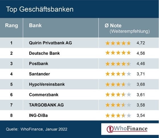 Aus Kundensicht ist die Quirin Privatbank (www.qiuirinprivatbank.de) erneut die beste Bank Deutschlands. Die auf unabhängige Beratung spezialisierte Bank liegt sowohl bei den Geschäftsbanken insgesamt sowie im Spezialranking zum Thema Geldanlage ganz vorn. Das zeigt die aktuelle Auswertung tausender geprüfter Kundenbewertungen auf dem Finanzportal WhoFinance.
