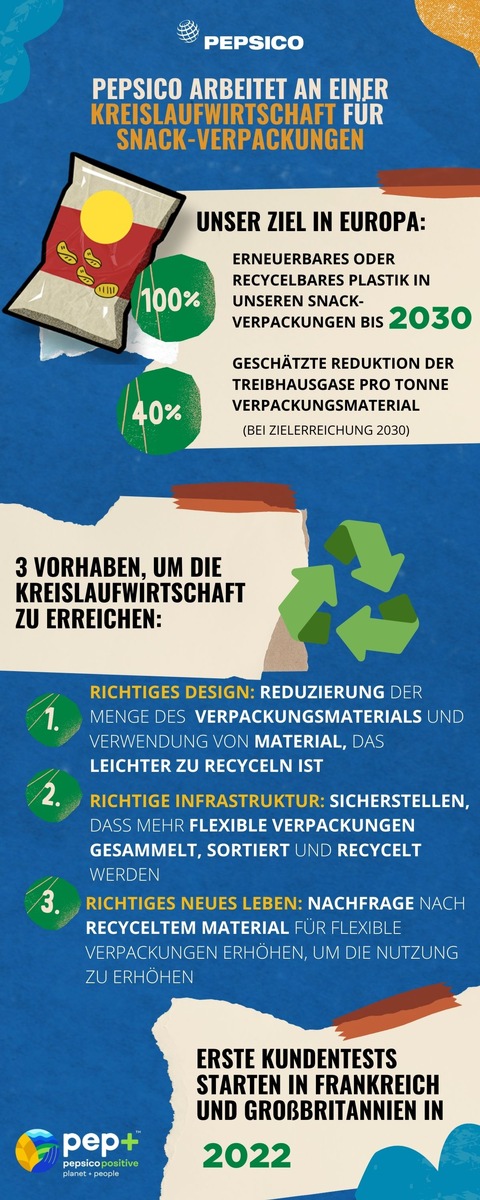 PepsiCo Europe setzt sich dafür ein, dass europaweit ehrgeizige Recyclingziele für flexible Kunststoffverpackungen festgelegt werden. Außerdem macht sich das Unternehmen für die Ausweitung von Deponieverboten stark sowie die rasche Einführung von EPR-Gebühren (Erweiterte Herstellerverantwortung) in ganz Europa, um so das Sammeln, Sortieren und Recycling flexibler Folien und letztlich die Entwicklung einer Kreislaufwirtschaft für flexible Kunststoffe voranzutreiben. PepsiCo investiert zudem in Technologien, die das Sortieren und Recyclen weiter verbessern sollen und testet mit mehreren seiner Marken bis 2022 im Rahmen des Holy Grail 2.0, einem Konsortium für digitale Wasserzeichen, den Einsatz von Smart Packaging in Deutschland und Frankreich.