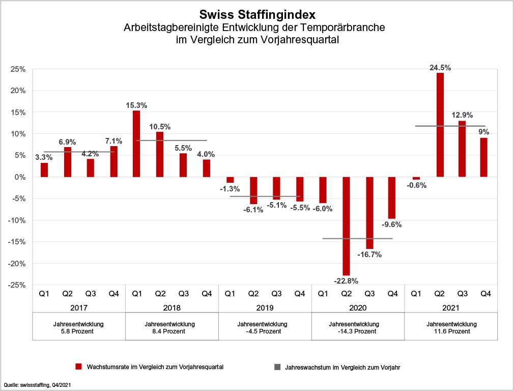 Swiss Staffingindex: Temporärbranche erholt sich 2021 von Corona-Schock