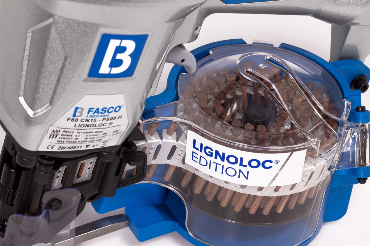 LIGNOLOC® ist der erste magazinierte Holznagel für den zukunftsorientierten Einsatz in der industriellen Fertigung und ökologischen Holzverarbeitung. Die revolutionären Holznägel werden aus mitteleuropäischem Buchenholz gefertigt. Durch die spezielle Ausprägung der Nagelspitze und die Hitze, die durch Reibung beim Eintreiben des Nagels entsteht, verschmilzt das Lignin des Holznagels mit dem des Umgebungsholzes zu einer stoffschlüssigen Verbindung.