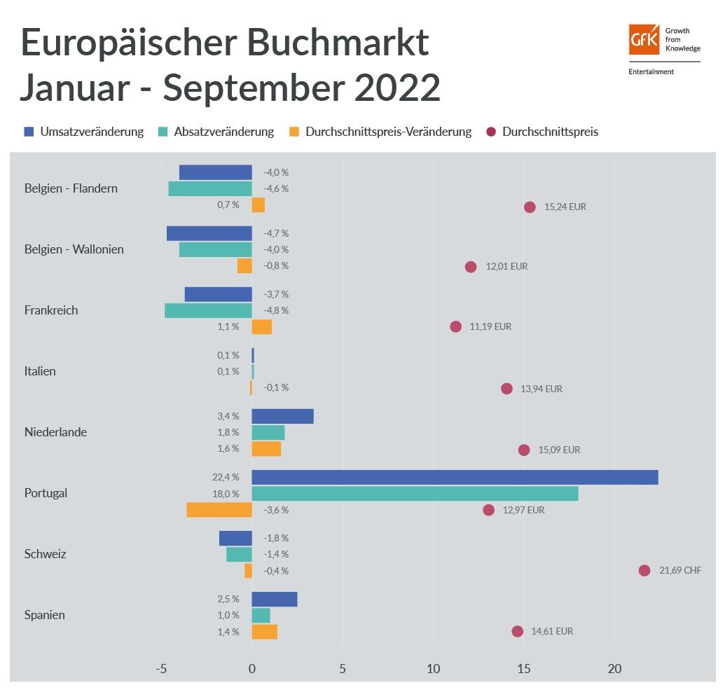 In Portugal (+22,4 Prozent), den Niederlanden (+3,4 Prozent) und Spanien (+2,5 Prozent) setzten Bücher zwischen Januar und September 2022 erneut mehr um als im Vorjahreszeitraum. Auch die verkaufte Anzahl ging nach oben, wenngleich etwas weniger deutlich. Ein klarer Trend ist bei den Durchschnittspreisen dagegen nicht auszumachen: Während Titel in Spanien (+1,4 Prozent) und den Niederlanden (+1,6 Prozent) teurer wurden, gingen die Preise zum Beispiel in der Schweiz (-0,4 Prozent) und Portugal (-3,6 Prozent) zurück.