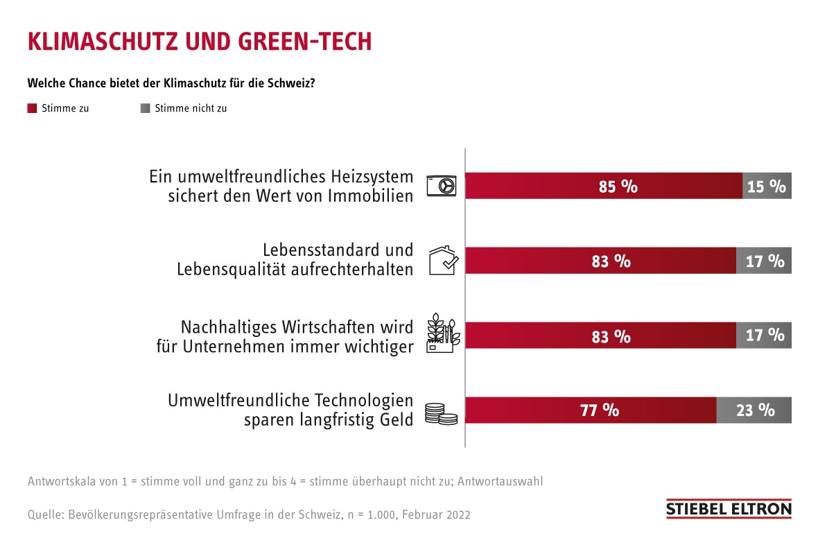 Die Schweiz ist beim Klimaschutz zurückgefallen: Das Zwischenziel bei der CO2-Absenkung wurde zuletzt im Verkehr und Gebäudebereich verfehlt. Damit die Emissionen deutlicher sinken, ist eine Verstärkung der Klimaschutz-Massnahmen notwendig. Die Schweizerinnen und Schweizer erkennen darin durchaus Chancen: Beispielsweise sind 85 Prozent der Auffassung, dass ein nachhaltiges Heizsystem den Wert von Häusern und Wohnungen sichert. Das sind Ergebnisse aus dem Energie-Trendmonitor 2022. Dazu wurden im Auftrag von STIEBEL ELTRON 1?000 Schweizerinnen und Schweizer bevölkerungsrepräsentativ von einem Marktforschungsinstitut befragt.