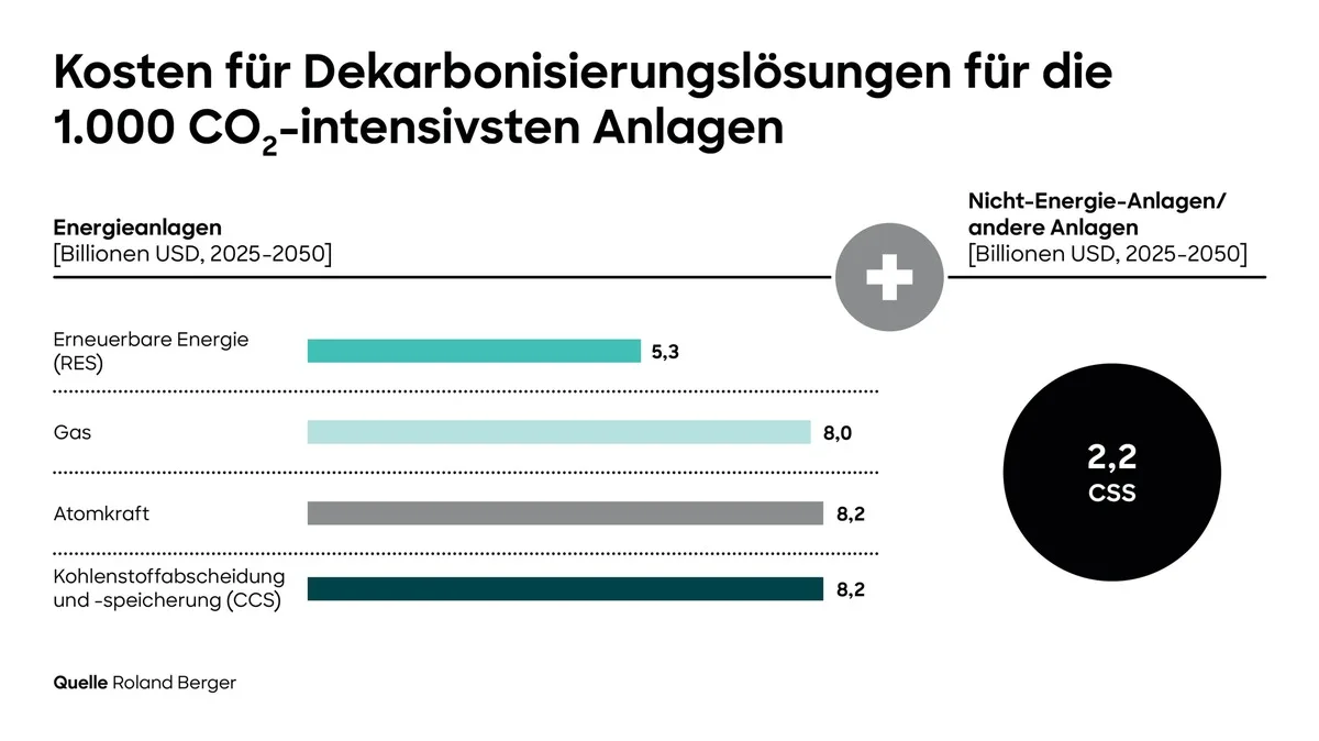 Für die Dekarbonisierung der betrachteten Anlagen gibt es verschiedene Technologieoptionen, wie die Analyse zeigt: Die Bandbreite reicht von der Umstellung auf erneuerbare Energien, Kernenergie oder Erdgas bis zur Abscheidung des bei fortgesetzter Anwendung fossiler Energien entstehenden Kohlendioxids und dessen Einlagerung (CCS). Je nach Dekarbonisierungslösung ergeben sich unterschiedliche Kosten für die vollständige Dekarbonisierung. Kernenergie sowie die Umstellung auf Gas sind mit jeweils rund 10,5 Billionen US-Dollar über den Zeitraum von 2025 bis 2050 die teuersten Optionen. Darauf folgt CCS mit 10,3 Billionen US-Dollar. Die Umstellung auf erneuerbare Energien kommt mit 7,5 Billionen US-Dollar am günstigsten. Über die Zeitspanne verteilt würde dies jährliche Kosten von 0,3 bis 0,4 Billionen US-Dollar bedeuten. Das wären im Vergleich weniger als 20 Prozent der globalen Ausgaben für beispielsweise Forschung und Entwicklung (2,3 Billionen US-Dollar) im Jahr 2021.