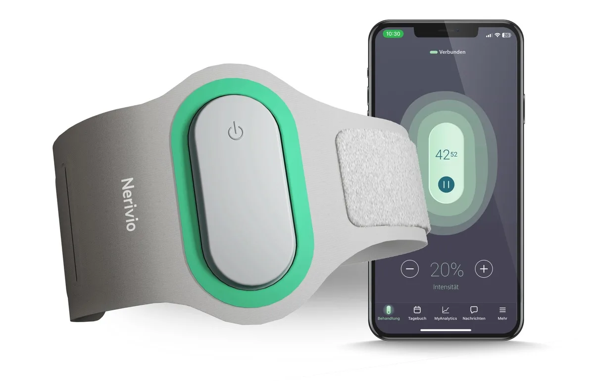 Nerivio® ist ein verschreibungspflichtiges, nicht-invasives Gerät für die akute und vorbeugende Behandlung von Migräne mit oder ohne Aura für Erwachsene und Jugendliche ab 12 Jahren. Nerivio® kann am Oberarm getragen werden und wird über eine Smartphone-App gesteuert. Jedes Neuromodulations-Armband ist auf 18 Anwendungen mit einer Dauer von je 45 Minuten ausgelegt. Es sollte innerhalb von 60 Minuten nach Beginn der Kopfschmerzen oder der Aura[3] zur akuten Behandlung von Migräne oder jeden zweiten Tag zur Vorbeugung eingesetzt werden. Das Gerät nutzt den Mechanismus der Remote Electrical Neuromodulation (REN), um die körpereigene konditionierte Schmerzmodulation (CPM) zu aktivieren. Das geschieht durch die Stimulierung nozizeptiver Nervenrezeptoren am Oberarm, welche die natürliche Schmerzlinderung im Hirnstamm aktivieren. So wird der Migräneschmerz gelindert[4].
