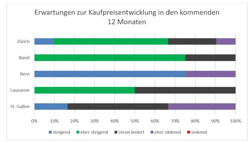 Die befragten Expert*innen blicken optimistischer auf den Wohneigentumsmarkt als noch vor einem Jahr – und das in allen fünf untersuchten Regionen (Zürich, Basel, Bern, Lausanne, St. Gallen). Im Gegensatz zur letztjährigen Umfrage, bei der insbesondere in Bern noch von sinkenden Kaufpreisen ausgegangen wurde, zeigt sich nun eine klare Trendwende. Nachdem die raschen Zinssteigerungen im vergangenen Jahr den Wohneigentumsmarkt merklich gebremst hatten, erwägen nun wieder mehr Personen den Erwerb eines Eigenheims, da die Zinsen wieder gesunken sind. Zudem macht das steigende Mietpreisniveau den Kauf eines Eigenheims finanziell attraktiver, sofern die Lebensumstände dies zulassen und genügend Eigenkapital vorhanden ist.