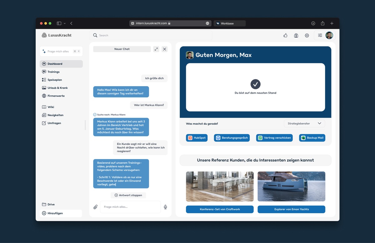 • Schnelle Antworten auf Mitarbeiterfragen: Der AI-Assistent ist rund um die Uhr verfügbar und greift auf die internen Daten deines Unternehmens zu, um präzise Antworten zu liefern. Ob es um Richtlinien, Prozesse oder spezifische Anfragen geht – der Assistent liefert die Informationen in Sekundenschnelle.