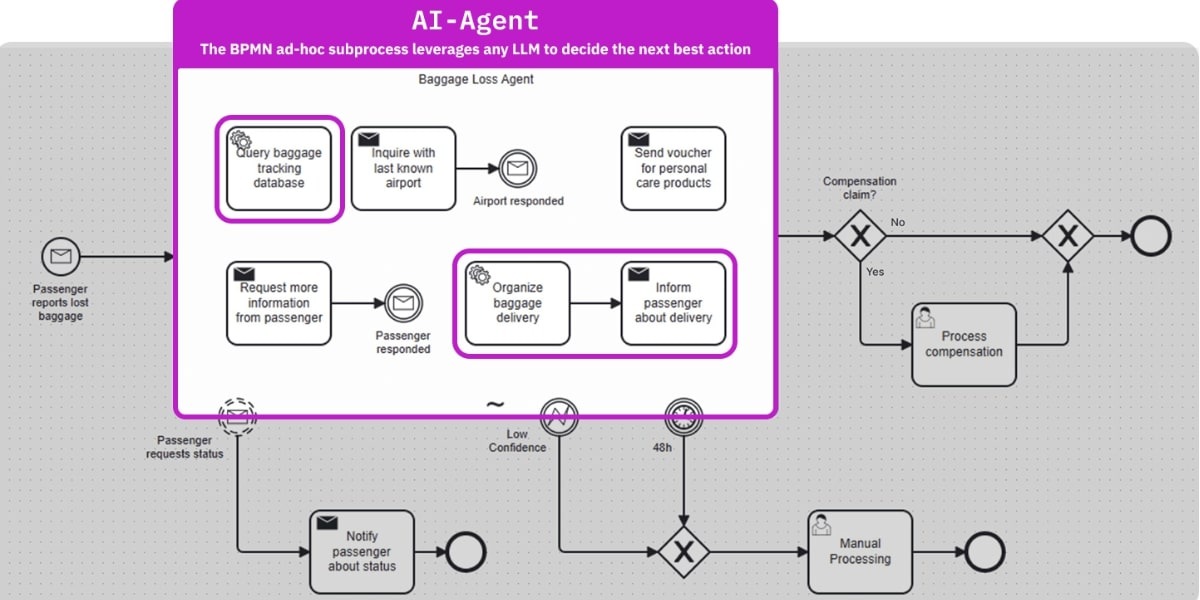 • Ad-hoc Sub-Prozesse – Aufgaben können dynamisch aktiviert werden, ohne die Abfolge im Vorfeld exakt festzulegen. Durch die Nutzung von Ad-hoc Sub-Prozessen in BPMN (Business Process Model and Notation) können KI-Agenten innerhalb eines definierten Rahmens Aufgaben eigenständig verwalten, sie in beliebiger Reihenfolge ausführen, und Schritte situationsabhängig wiederholen oder überspringen. Dank der nativen Unterstützung von Ad-hoc Sub-Prozessen und KI-Konnektoren bietet Camunda die Möglichkeit, KI mit reduziertem Risiko in Prozesse zu integrieren und zu testen.