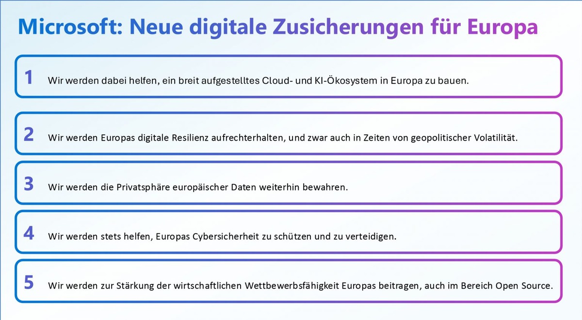 In einer Zeit geopolitischer Volatilität verpflichten wir uns, digitale Stabilität sicherzustellen. Darum kündigt Microsoft heute fünf digitale Zusicherungen für Europa an. Dazu gehört der Ausbau unserer Cloud- und KI-Infrastruktur in Europa, um es all diesen Ländern möglich zu machen, ihre wirtschaftliche Wettbewerbsfähigkeit mit diesen Technologien zu stärken. Dazu gehört aber auch eine klare Verpflichtung, Europas digitale Resilienz sicherzustellen – unabhängig von geopolitischen oder weltwirtschaftlichen Spannungen.