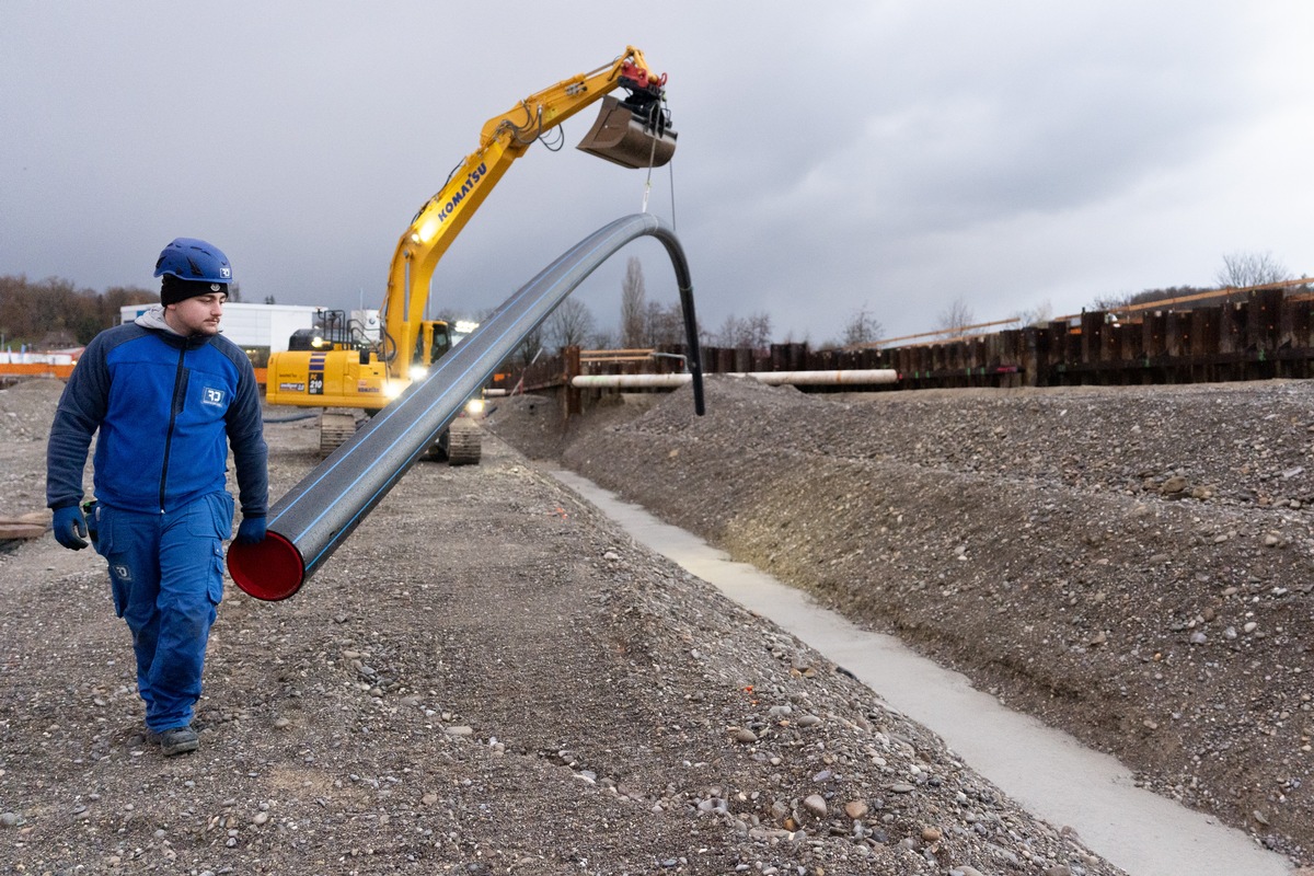Bereits realisiert worden sind die Werkleitungen – und mit ihnen vier Düker, verlegt von der Ramseyer und Dilger AG. Düker fungieren als Umleitungen und dienen üblicherweise dazu, Strassen, Kanäle oder Flüsse zu unterqueren. Beim neuen Polizeizentrum sind sie wegen des hohen Grundwasserspiegels nötig. Sie halten das Gewässer in Schach, sodass es nicht von unten an das Gebäude drückt. Auch wird das Regenwasser, welches das Grundstück quert, mithilfe der Düker um- und zusammen mit dem Grundwasser abgeleitet.