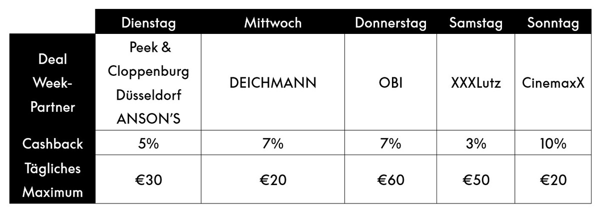 Im Rahmen der Deal Week erhalten Kund:innen bei ausgewählten deutschen Marken Cashback, wenn sie im Geschäft kontaktlos mit der PayPal-App bezahlen. An wechselnden Tagen gibt es bis zu 10 % Geld zurück. Die Aktionen wiederholen sich wöchentlich – wer regelmäßig mit PayPal vor Ort zahlt, kann so pro Monat hunderte Euro Cashback sammeln.