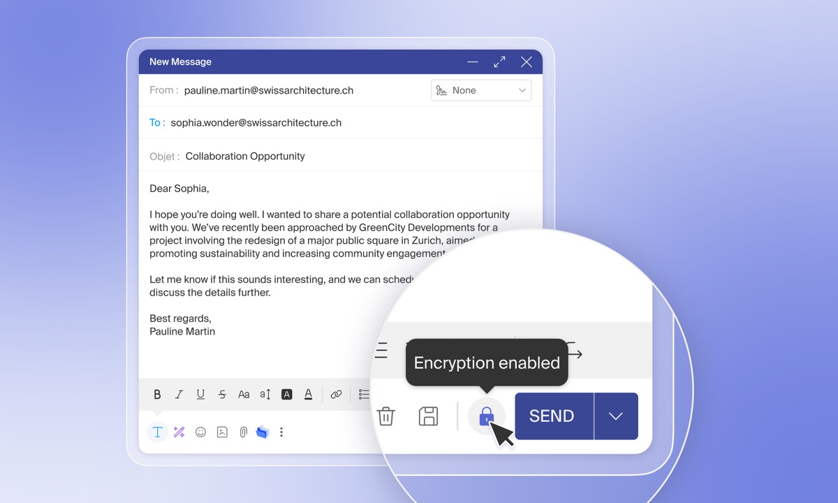 Infomaniak hat ein Verschlüsselungssystem entwickelt, das auf anerkannten Standards (OpenPGP, ECC, AES-256-GCM) beruht und eine unabhängige Architektur aufweist, die vollständig in der Schweiz gehostet wird. Beim Verfassen eines E-Mails wird die Verschlüsselung per Klick aktiviert.