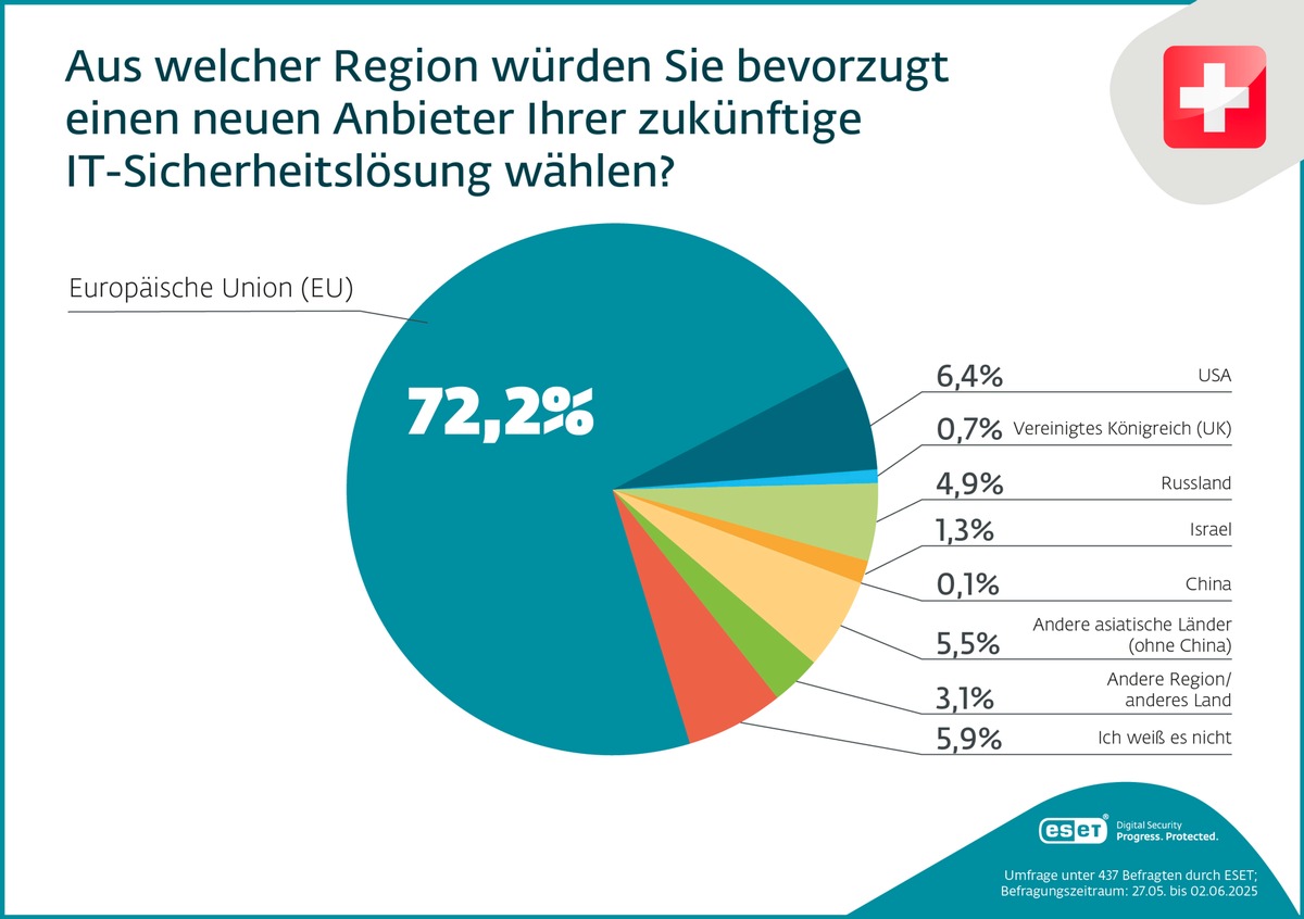 Die Herkunft von IT-Sicherheitslösungen gewinnt auch in der Schweiz zunehmend an Bedeutung. Das zeigt eine aktuelle, repräsentative Umfrage des europäischen IT-Sicherheitsherstellers ESET, durchgeführt von Techconsult. Angesichts der aktuellen geopolitischen Lage und wachsenden Unsicherheiten rund um den Datenschutz setzen immer mehr Schweizer Unternehmen auf europäische Anbieter, um die Sicherheit ihrer Daten langfristig zu gewährleisten.
