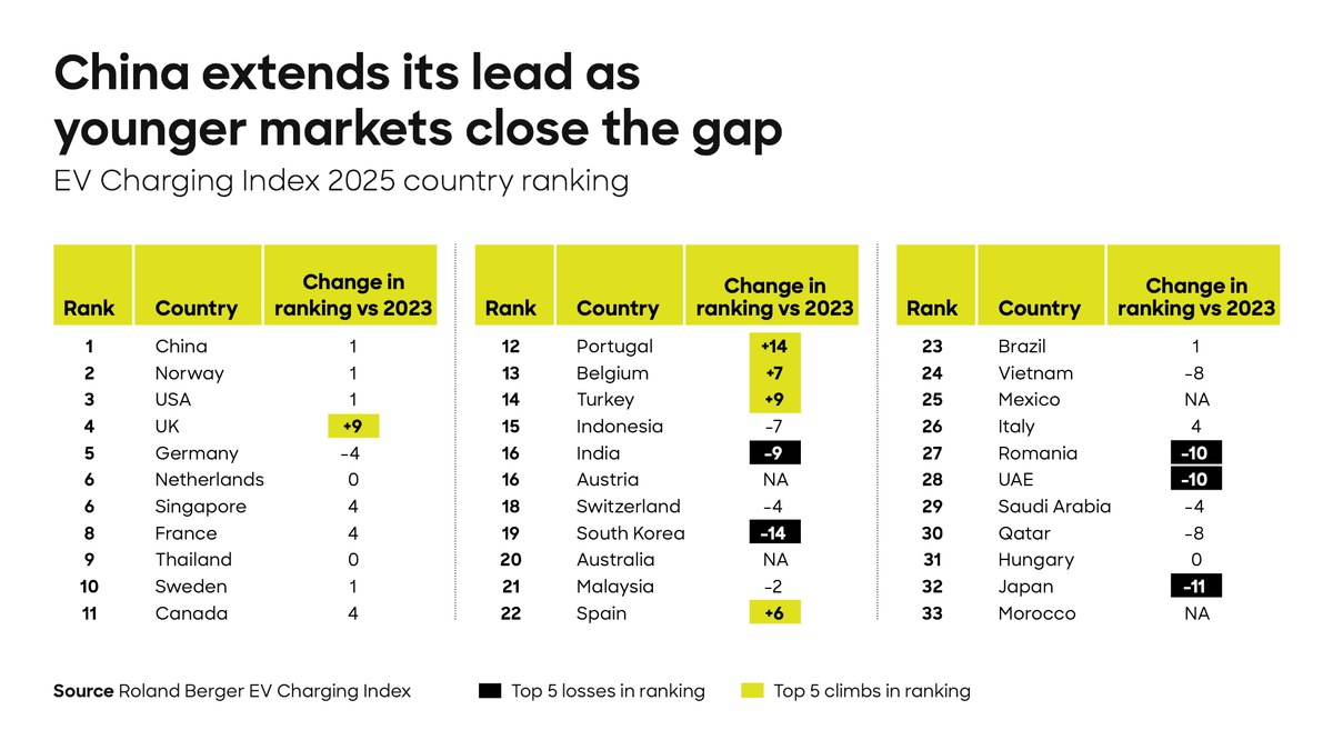 Roland Berger EV Charging Index 2025: Deutschland fällt bei E-Mobilität zurück, China baut Vorsprung weiter aus