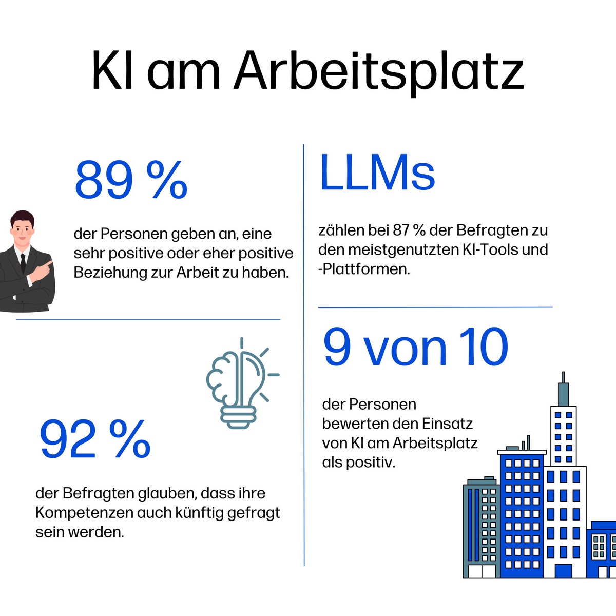 Fast 90 Prozent der Befragten geben an, eine sehr positive oder eher positive Beziehung zur Arbeit zu haben. Wer KI regelmässig nutzt, empfindet seine Tätigkeit häufiger als erfüllend und motivierend. Personen, die KI nur oberflächlich kennen oder ihr skeptischer gegenüberstehen, sind zwar ebenfalls überwiegend zufrieden, nehmen ihre Arbeit aber auch als leicht belastend wahr. Je vertrauter der Umgang mit KI ist, desto grösser ist das Vertrauen in die eigene Zukunft: 92 Prozent der Befragten glauben, dass ihre Kompetenzen auch künftig gefragt sein werden.